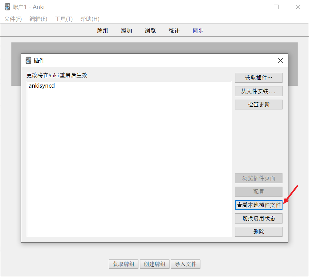 点击 查看本地插件文件 ,在打开的文件夹中新建一个目录 ankisyncd ,里面添加一个 __init__.py